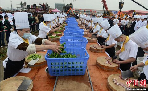약 3톤의 고추와 돼지고기를 손질하고 있다.