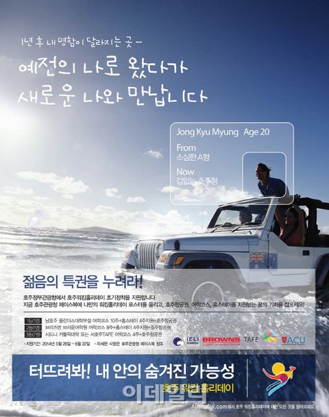호주 워킹 홀리데이 포스터 포맷에 맞춰 가장 크리에이티브하게 자신의 이야기를 표현한 30명에게 최종 미션의 기회가 주어지고 최종 미션을 통과하신 4분께 호주 항공권은 물론, 초기 정착을 위한 어학코스와 숙소까지 상상을 초월하는 혜택이 제공됩니다.