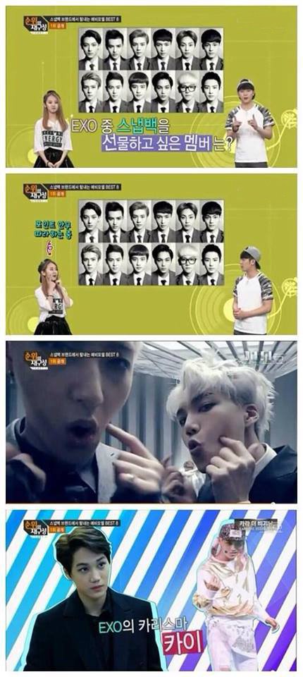 나 봤어 이거 주제가 스냅백 브랜드에서 탐내는 예비모델 베스트 8 이라고 해서 그룹당 한명씩 스냅백 제일 잘 어울릴것같은 멤버 뽑는거 였는데 8위부터 쭈욱 뽑았어~ 8위는 방탕에 지민 7위는 샤이니 온유 6위는 미스에이 수지랑페이 5위는 소녀시대 써니 4위는 빅뱅 태양 3위는 블락비 지코 2위는 비원에이포 바로 그리고 1위가 엑소 카이였어!!!!! 우리종인이 흐흐흐흐~ 엑부심 카부심 ㅋㅋ