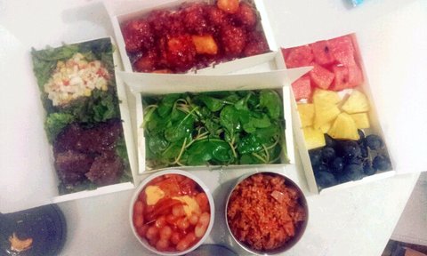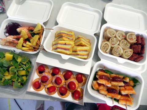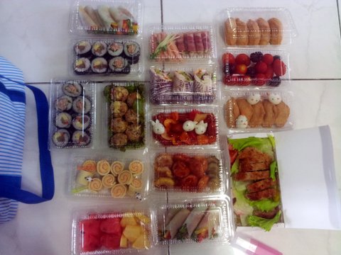 과일샐러드, 닭봉, 과일롤, 연어초밥, 소고기초밥