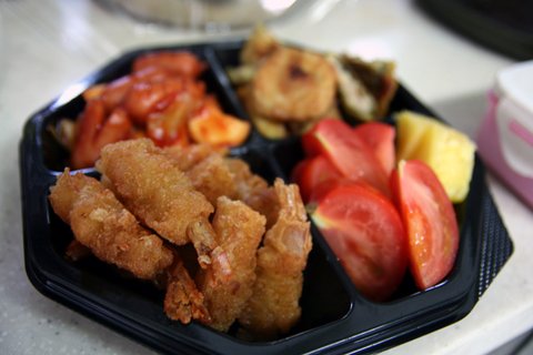 소세지케챱볶음, 새우튀김, 과일, 흐릿하게 보이는건 전이예요 ㅋㅋ 그리고 사진엔 없지만 김치볶음밥까지~~