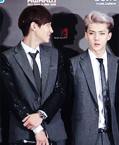 세훈이 머리에 붙은거 떼주는 찬열이