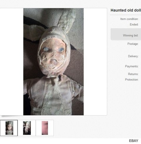 ‘귀신 들린 인형’은 최근 영국 인터넷 경매 사이트를 통해 매물로 나왔다. 토끼 모자를 쓴 인형의 얼굴은 인형이 아니다. 유령 혹은 공포 영화에 나오는 사탄의 인형 등을 능가하는 모습이다. 또 아주 오래된 것처럼 낡았다. 판매자는 이 인형이 아이들의 얼굴에 상처를 입힌다고 주장했다. 또 밤에 이상한 소리가 나며, 아이가 몽유병 증상을 보인다고 밝혔다. 그 이유가 이 인형에 있다는 것이 판매자의 설명이다.