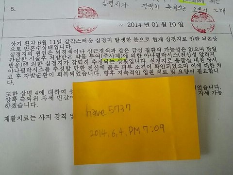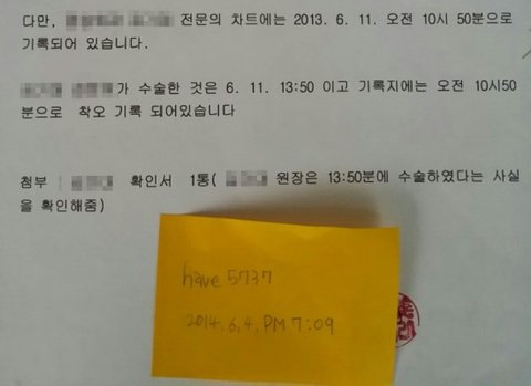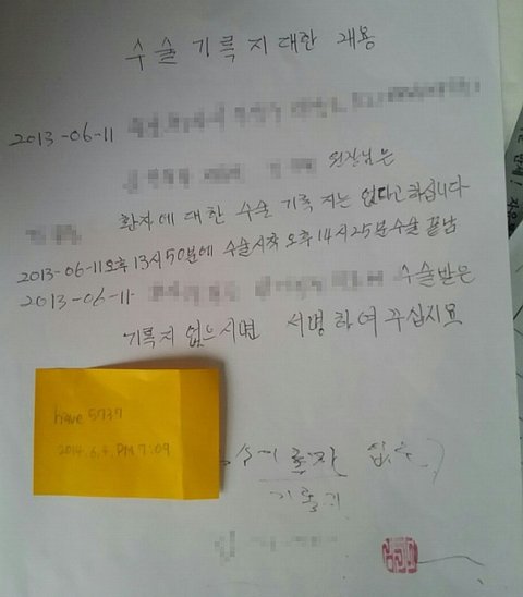 아래는 수술기록지는 없고 진료차트만 있다는 내용과 고쳤다는 내용의 진술서↓