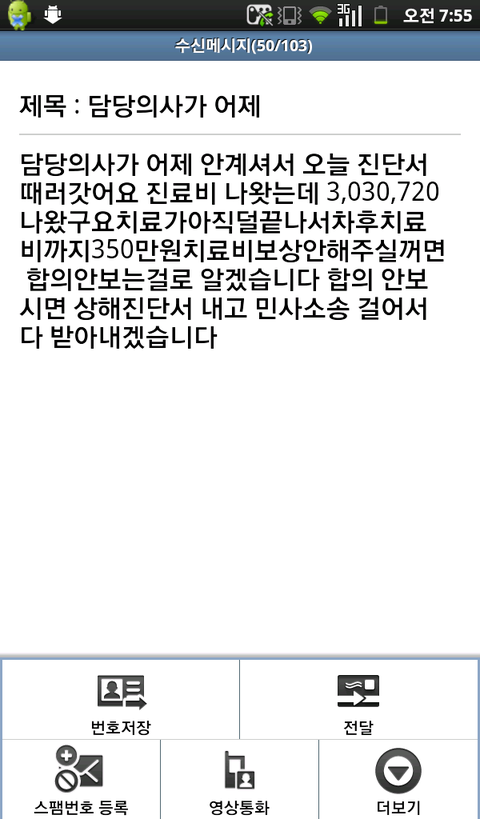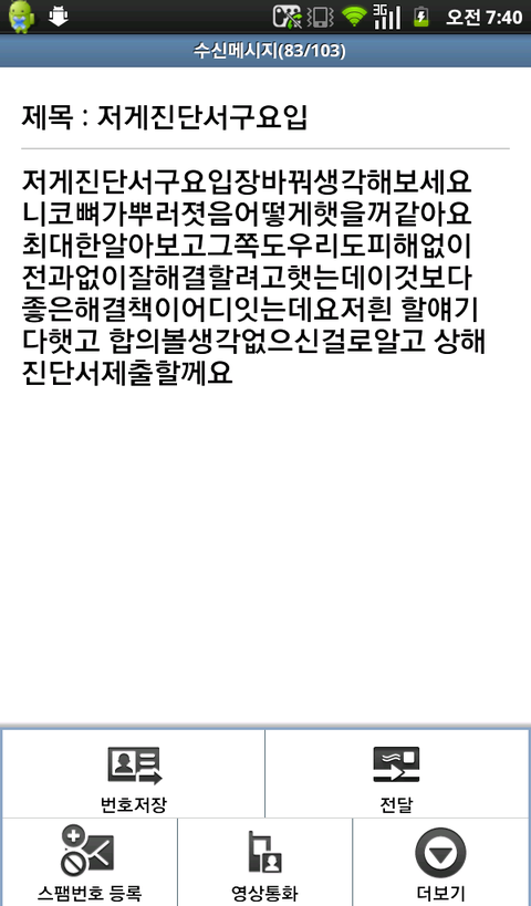 아 그리고, 문자내용 중 일부 스샷과, 그 어미되시는 분이 진단서라며 보내온 사진도 첨부합니다. 진단서 내용 보이시는분 계시면 좀 알려주실래요? 어떻게봐도 내용이 안보이네요^^