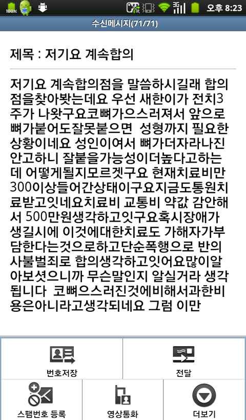 이후부터 그 맞은 놈 엄마라는 사람이 공갈협박을 본격적으로 시작하더군요.며칠 후 문자로, 합의할거냐고 연락이 오기에