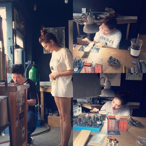 레인보우 재경이 자신이 제작한 은목걸이와 은팔찌를 착용한 뒤 포즈를 취하고 있다