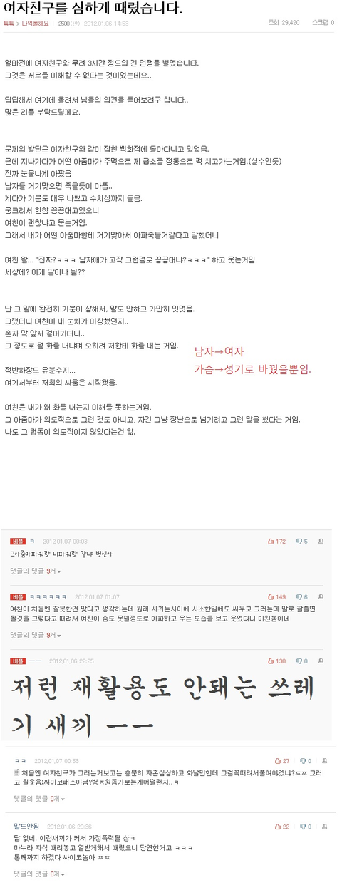 8. 내용이 너무 길어서 안읽었다라는 드립 (이게 남녀가 바뀐 글이었으면 그럴까? ㅋㅋㅋ)
