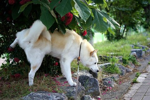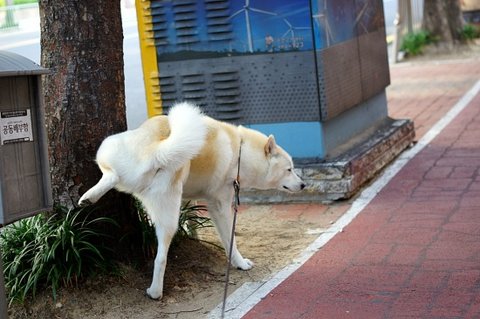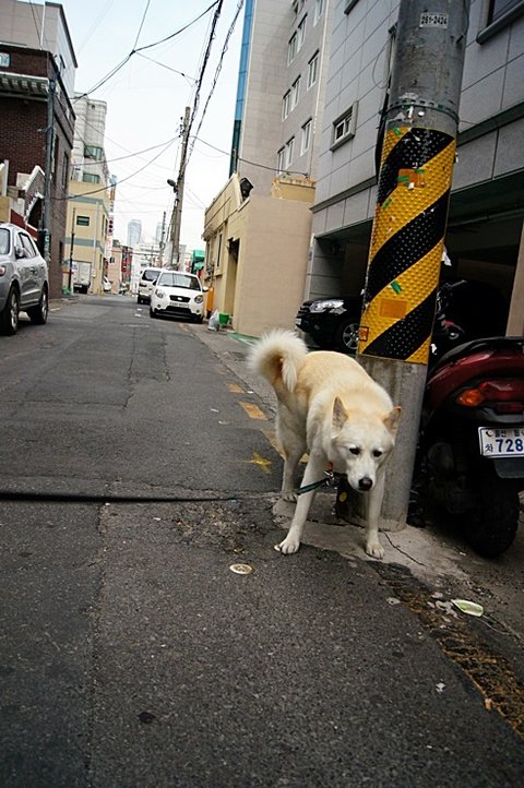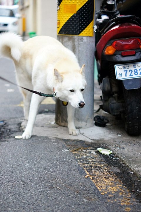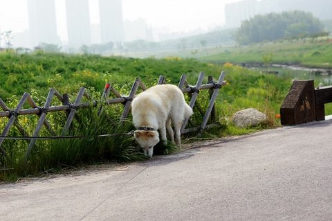 아침 산책 나온 심바.. 시원하게 쉬하고 있어요.