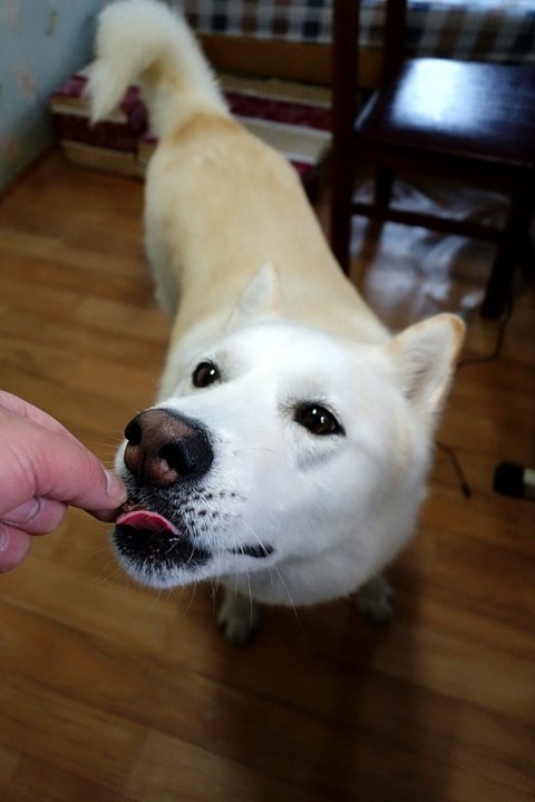 간식을 보더니 기분 좋아졌어요.ㅎㅎ 귀가 뒤로 휙~ ㅋㅋ