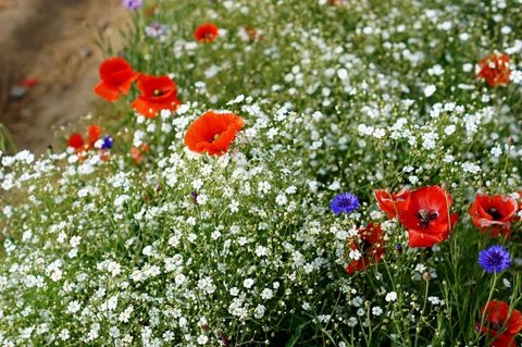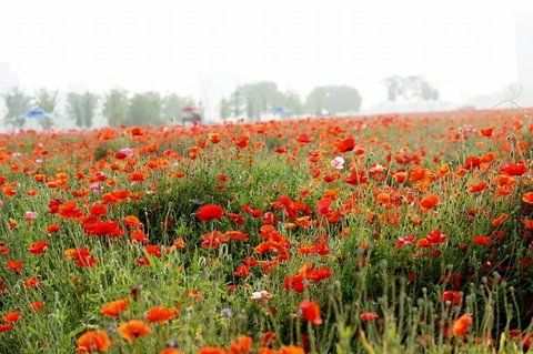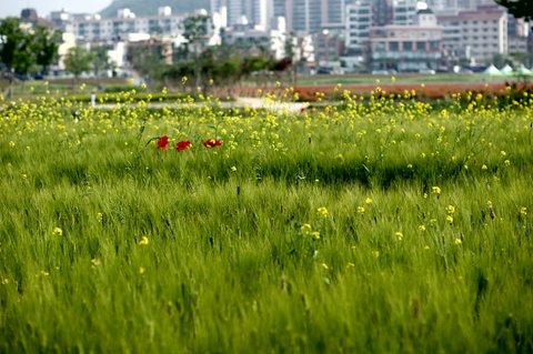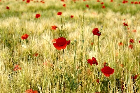 누렇게 익은 보리밭과, 빨간 양귀비가 참 잘 어울리네요.