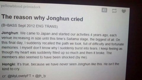 종훈::데뷔한지도(한국말고)4년이됐다 작은 홀에서 시작해서 지금 이렇게까지 큰 홀로 점점 더 키워오면서 우리가 겪은 많은 힘든일들 또 누렸던 행운,기회들 그런게 갑자기 스쳐지나가듯이 떠올라서 눈물이났다 나도 왜 울었는지는 모르겠다 그냥 치밀어올랐다(번역투ㅈㅅ그냥대충이런뜻)