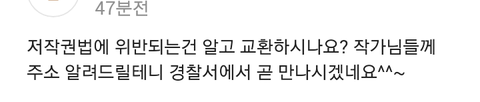 저 진짜 다른사람들도 다 하길래 괜찮은줄알고 처음으로 교환했는데 정말 공유하는사람도 많은데 저한테 이런댓글이 왔어요 저이제 잡혀가는건가요? 빨간줄에 벌금물어요?ㅠㅠㅠㅠㅠㅠㅠ저진짜 어떡해요 엑소공금만쳐도 엄청나게 많은 블로그가나오는데 저진짜 작가님들이 고소하셔요?정말무서워요 블로그에 사과글도 올리고 삭제했는데 너무 무서워요