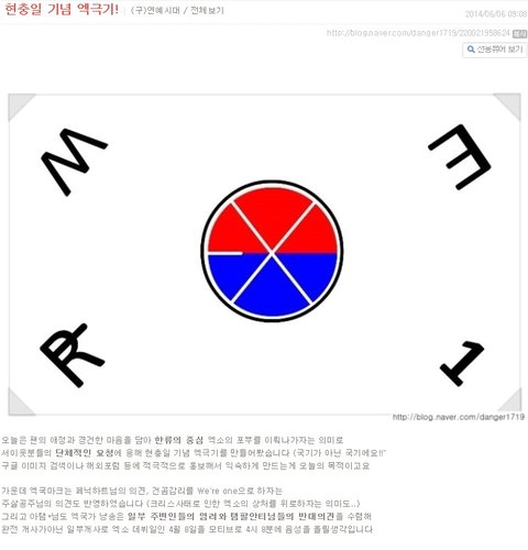 오늘은 팬의 애정과 경건한 마음을 담아 한류의 중심 엑소의 포부를 이뤄나가자는 의미로 이웃분들의 단체적인 요청에 응해 현충일 기념 엑극기를 만들어봤습니다.(국기가 아닌 국기에요!!"구글 이미지 검색이나 해외포럼 등에 적극적으로 홍보해서 익숙하게 만드는게 오늘의 목적이고요
