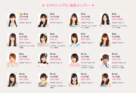 2014년 AKB48 1부리그에 들어간 걸그룹맴버들.... 마지막날까지 3위였던 와타나베 마유는 투표 마지막날 중국거부가 무려 35000장의 엘범을 사들여 나온 35000여표를 몰빵받음으로서 대역전극 성공... 1위당선...