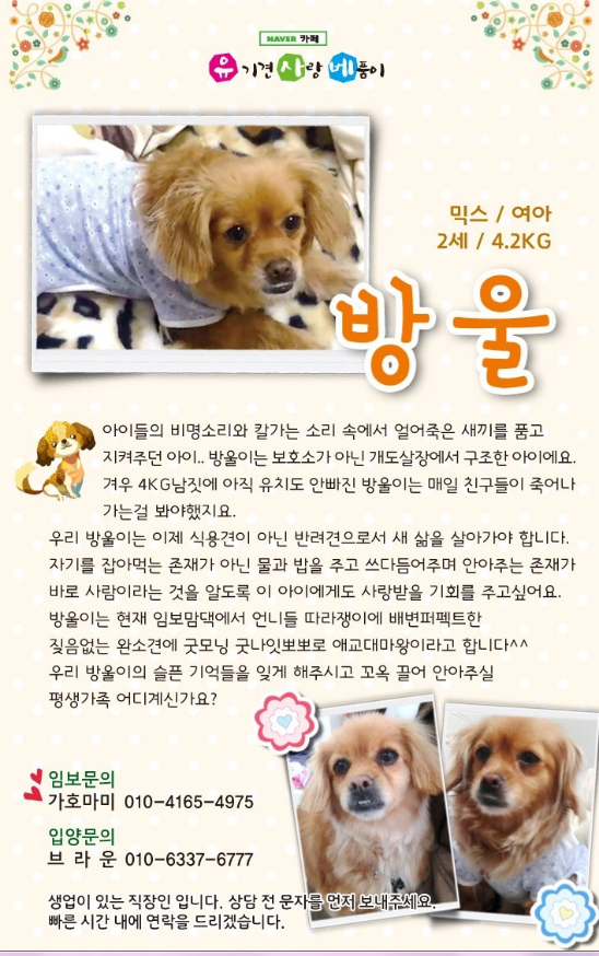 저는 네이버카페 '유기견사랑베품이'에서 활동하는 회원이랍니다.다름이 아니고, 네이트 동물사랑방을 종종 눈팅하던차에저도 유기견에 관심을 갖고있는 사람으로서 조심스레 임보일기를 올리려해서요..^^;블로그에도 틈틈이 올리고있지만 이웃은 별로 없고..;동물사랑방 글을 보며 유기견봉사를 하시는 분들 이야기도있고해서혹시나 스치듯이라도 관심을 가져주실 분들이 있을까하여글을 올려봅니다.