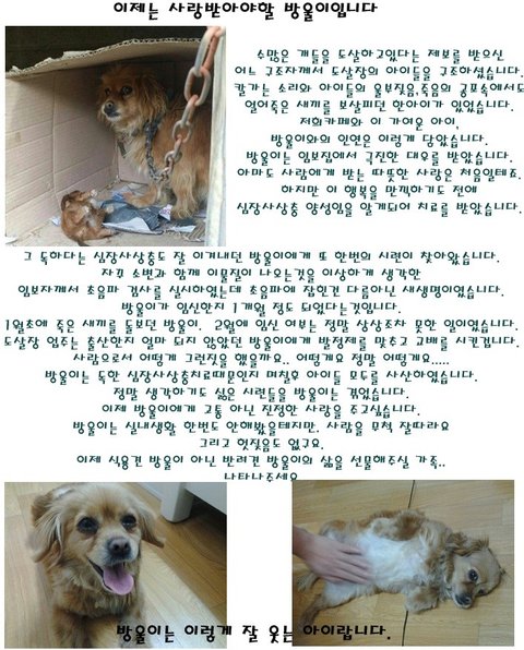 3월에 잠시임보하던 '누리'는 지난주에 입양되었고4월에 임보하던 '모츠'는 훈련학교에서 교육중..5월 10일부터 임보한 '방울이'의 이야기에요.소소하고 시시콜콜하지만하루하루 기록하던 방울이와의 이야기입니다..