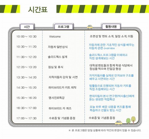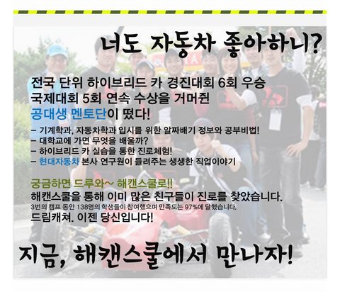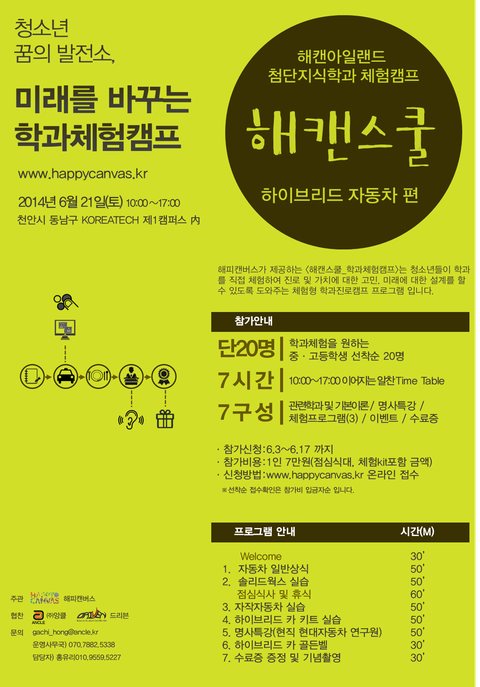 청소년 진로체험캠프/학과체험캠프를 운영하는 해피캔버스에서 기계과, 자동차과, 메카트로닉스 학과를 꿈꾸는 청소년을 위해 <해캔스쿨>-하이브리드 자동차 편을 연다고 합니다.