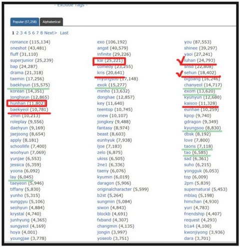 전세계 kpop호모녀들이 모이는 아시아 팬픽 사이트 1위 훈한(세루) 2위 카디3위 백열(찬백) 우리나라랑 다르게 이름 순서 상관안함