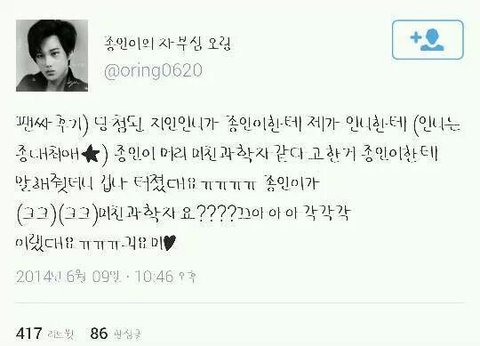 ㅋㅋㅋㅋㅋㅋㅋㅋ미친과학자 ㅋㅋㅋㅋ친구들이랑 했던말들인데 이제종인이도알게되다니 ㅋㅋㅋㅋㅋ아귀여워 ㅎㅎㅎ