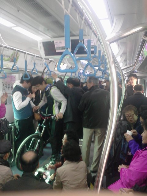 정리하자면 저기는 지하철 중에서도 자전저 칸으로 사진 속의 자전거를 끌고 온 분들은 아무 잘못이 없구요. 아래쪽에 보시면 자전거 칸임에도? 아니 사실 자전거 칸이건 그냥 좌석이건 지하철 바닥에 자리 깔고 앉아서 술을 쳐드시고 계시는 어르신들이 문제가 되는 것입니다.