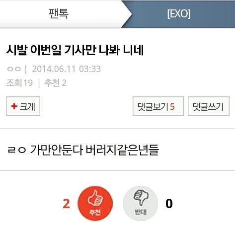 백현 글같으면 모든글에 백줌 추천수ㄷㄷ거리잖아 물론 진짜추천누른 백현팬도 있긴하겠지 그것처럼 아까 밤부터있었는데 백현 ㅈㅍㅇ로 물타기하고 비교하고 추반누르던 카이팬도 분명 있었을거야