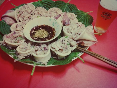 아직 오징어 속이 빠져 나오는 걸 막는 스킬이 부족해서 저렇게 깻잎으로 싸서 먹어요 ㅋㅋ