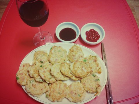 이건 와인만 먹기 그래서 집에 있는 두부랑 참치랑 으깨서 반죽해서 동그랑땡 만들어 봤습니다.