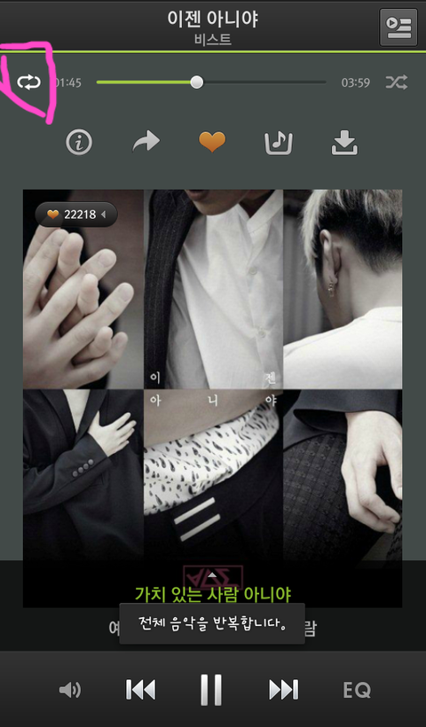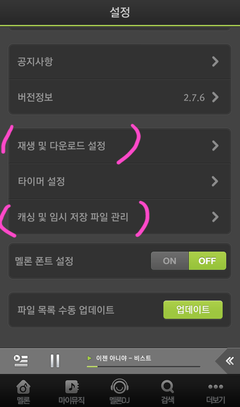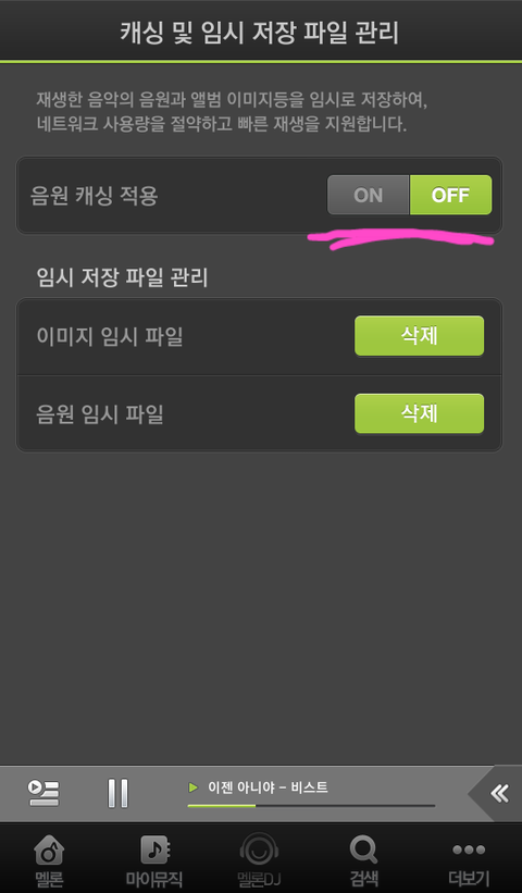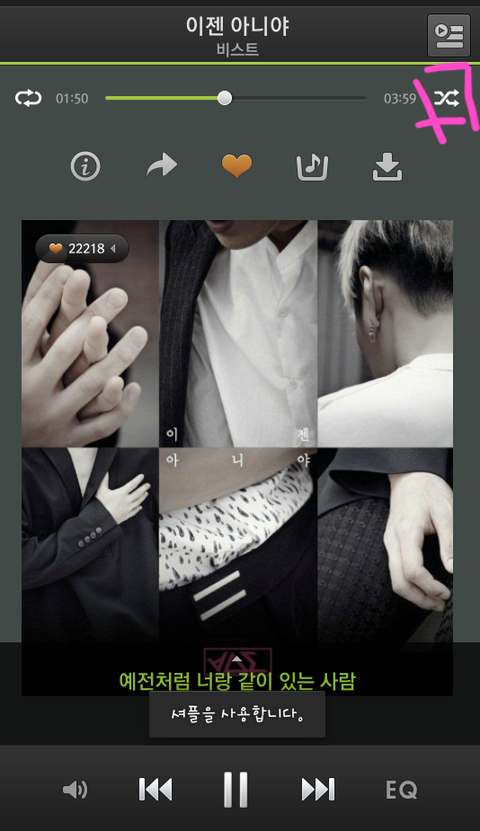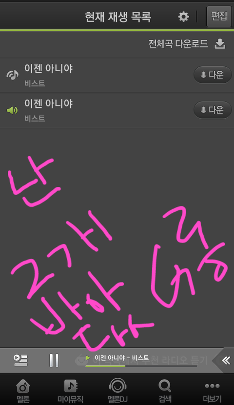 아니면 이젠아니야 쓰고 검색한뒤에 그거 누르면 회섹에사 흰색변해갖고 아래에 듣기 다운 담기가 있는데 듣기 클릭해놓으면 밑에 음악재생같은게 떠요!