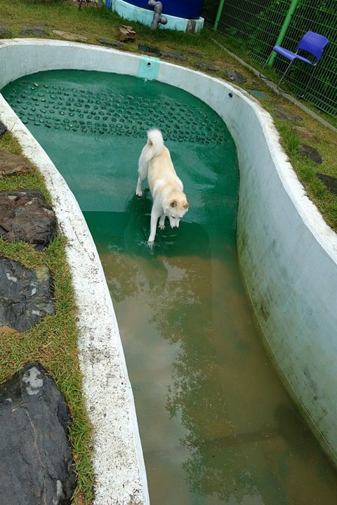 전날 멍멍이들이 신나게 수영해서 흙탕물이 된 수영장 물을 비우고 있더라구요