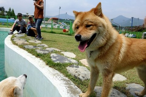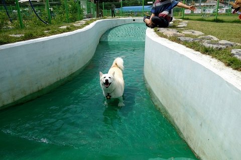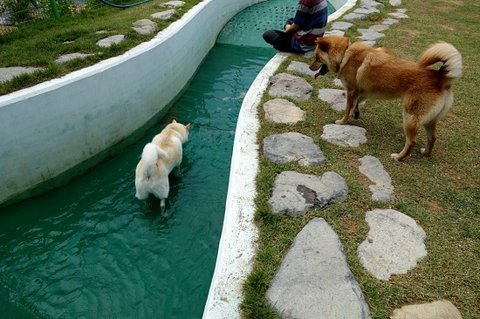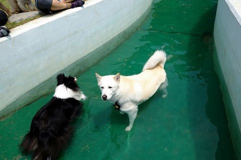 수영을 못하는 까미노 심바가 물에 들어간걸 보고 있어요 따라들어가지 못하더라구요