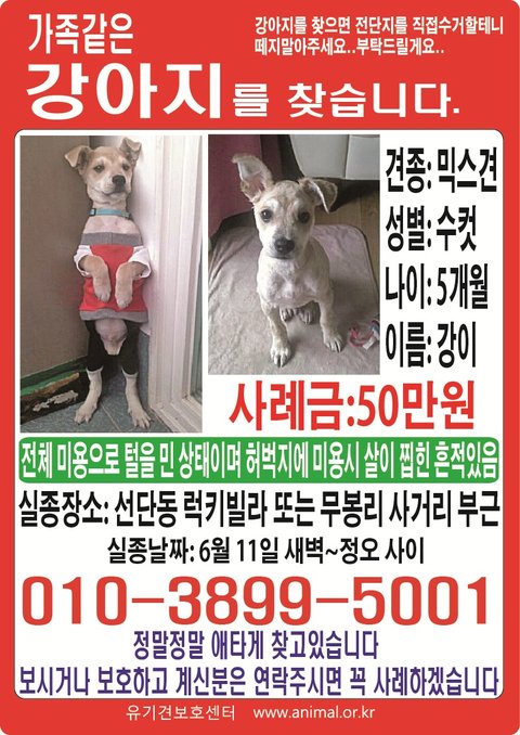 혹시 우리 강이를 보셨거나 보호하고 계시면 연락 부탁드립니다. 꼭 사례하겠습니다