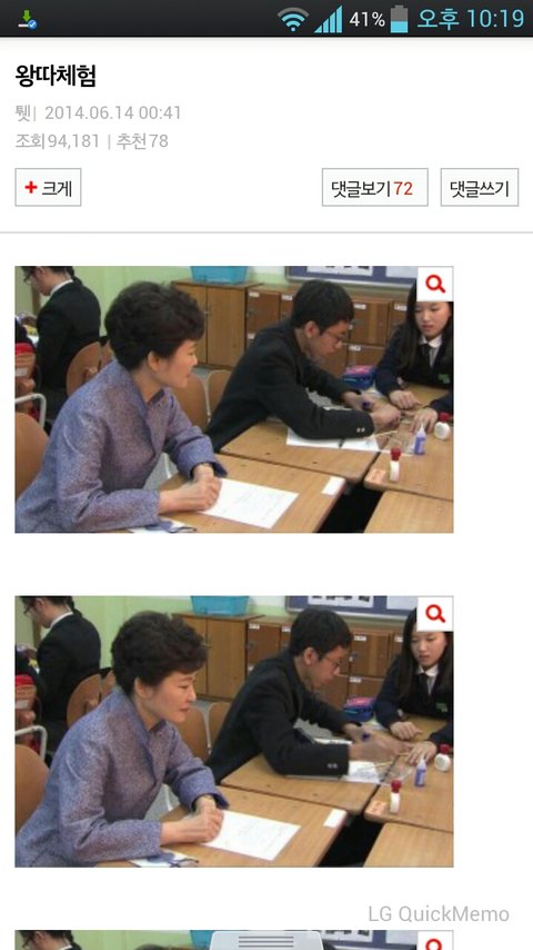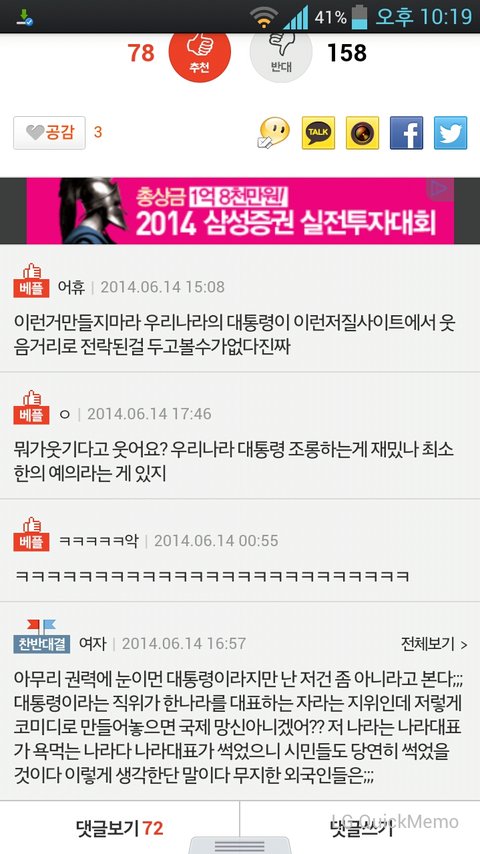 박대통령 사진 유머로 제목붙힌 게시글 퍼왔는데 댓글에서 "일국의 대통령한테 무슨 짓" 이지랄ㅋㅋㅋㅋ 합성한것도 아니고 심하게 모욕한 것도 아닌데 여기 혹시 청와대 알바들 있음? 난 무슨 대통령을 떠받들어야 하는 사람으로 여기는 사람들 처음봄. 댓글 읽어보면 다 선동당한건지 저지랄ㅋㅋㅋ 설마 네이트판 자체가 저런생각을 가진 곳임? 나정말 이해가 안되서 그러는데 너희도 저렇게 생각하냐? 정말 어이가 없음ㅋㅋㅋ