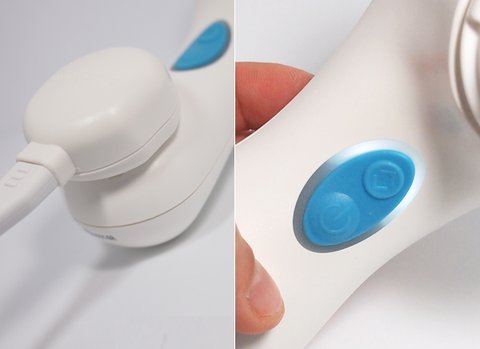 작동은 아래 전원 버튼 누르면 되구요, 위에 화살표 버튼으로 2단계 강도 조절이 됩니다.