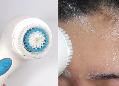 브러시에 물 묻히고 클렌저만 올려놓은 다음 바로 얼굴에 마사지 시작하는데