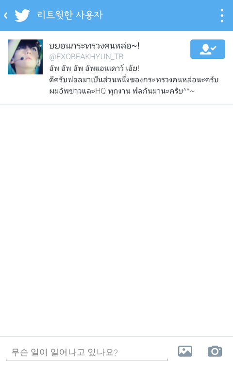 나 중국어 한다는앤데 쌤이 태국어로한번해보라고알려줘서 트위터어떤 태국엑소팬한테 트윗해서 보냈는데 그사람이 나 리트윗함ㅋㅋㅋㅋㅋㅋㅋㅋㅋㅋㅋㅋㅋㅋㅋㅋㅋㅋㅋㅋㅋㅋ참고로 그쌤 북경에서 고등학교나옴ㅋㅋㅋㅋㅋㅌㅌㅌ