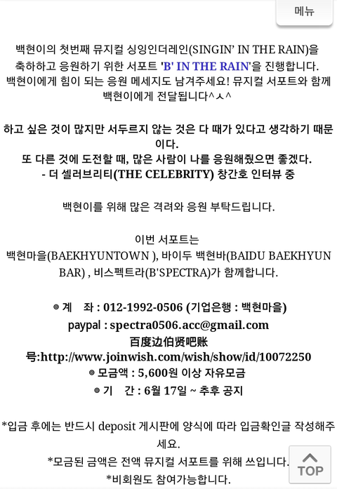 백현마을+바이두 백현바+비스펙트라에서 백현이 첫번째 뮤지컬 축하하고 응원하기위한 서포트를 진행한다함!!비회원도 참여 할수있다니깐 참여할 사람은 하세용~~♥