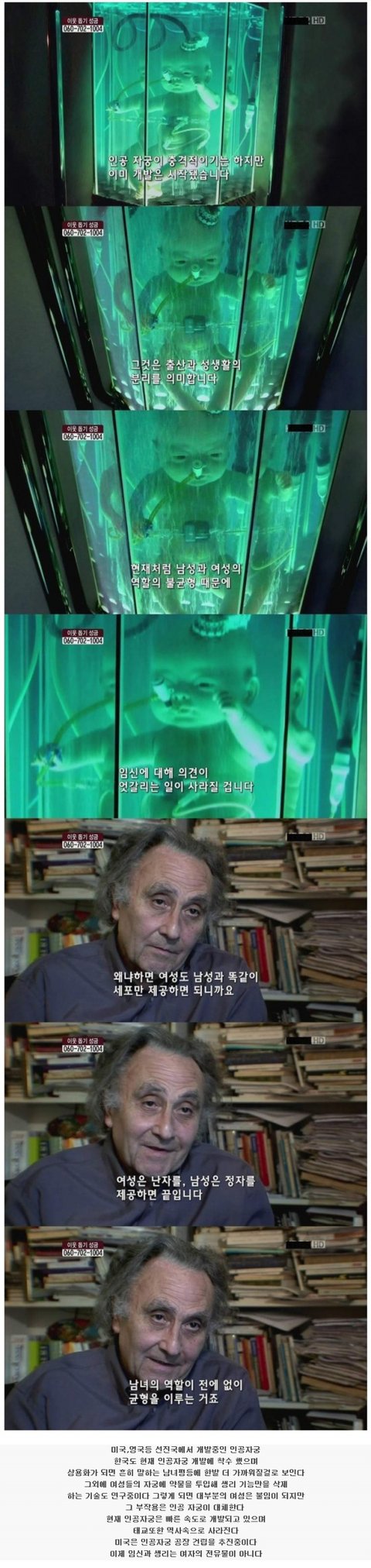 말이 좋아 인공자궁이지 사람 만들어내는 공장 같다. 윤리적 문제가 발생 할 가능성도 많고 가타카 같은 세상이 도래 할지도 모른일...