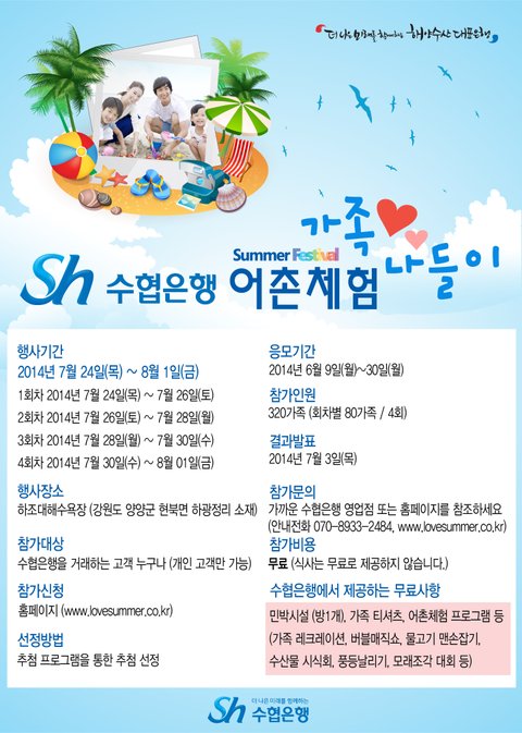 수협은행과 함께하는 2014년 어촌체험 가족 나들이 행사 안내입니다.