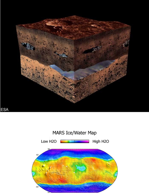 [화성의 지하와 극지방에 잠재되어 있는 물들]