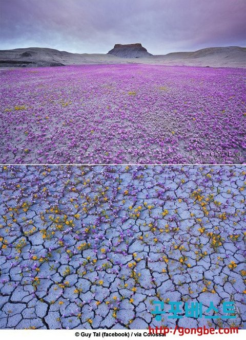 사막에 꽃이 피었다. 건조하고 척박하고 황량한 사막에 핀 꽃은 한두 송이가 아니다. 수천 수만의 꽃이다. 색깔로 평범하지 않다. 노랑색, 보라색의 야생 꽃이 지천이다. 꽃이 거대한 호수를 이룬 것 같은 신비한 풍경이다.