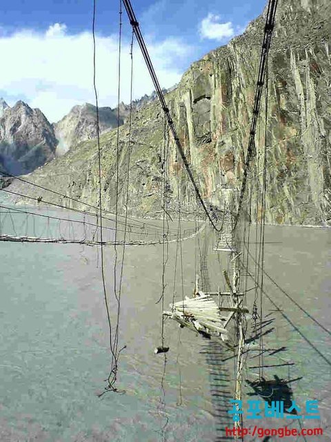 The local people of northern Pakistan use several suspension bridges to cross the many rivers in the region. The view from the Hussaini-Borit Lake Bridge is picturesque, not to mention precarious and potentially lethal.