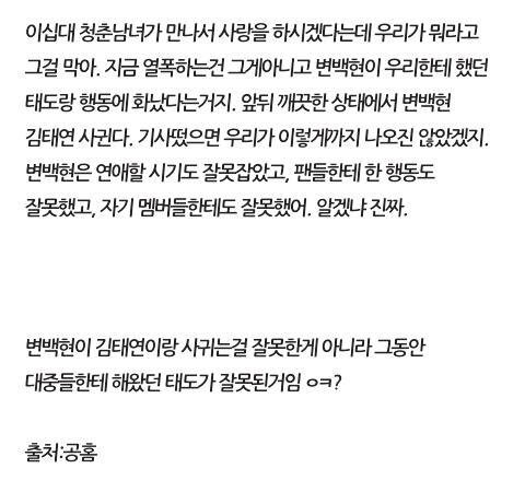 오늘 열애설 터지기 전 아침 눈뜨자마자 나: 벽반때 변백 이상한 사진 올라왔길래 그래도 애들 타격 안오면 좋겠어서 애들한테 글삭하라고 재촉함. 몇시간 후 열애설. 나 한심..