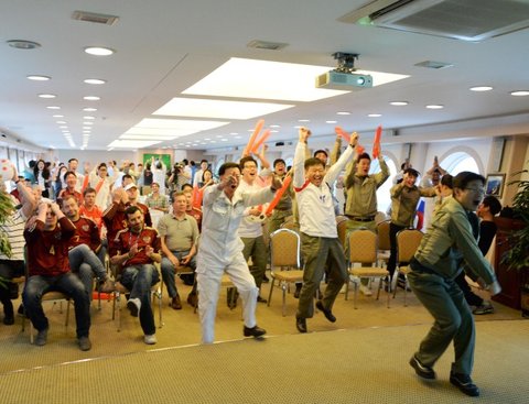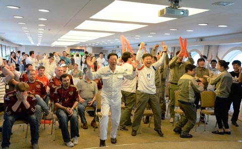 이근호선수 첫골 넣었을때.왼쪽에 앉아있는 외국인들은 마침 한국 STX 조선해양에 방문한 러시아 선주사 관계자들이 망연자실해하고있다.