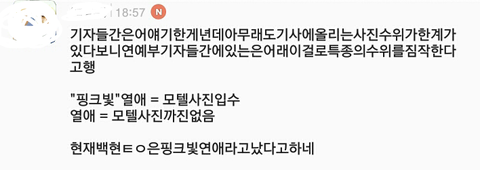 핑크빛열애면 ㅋㅋㅋㅋㅋㅋㅋ 호텔에서 나오다가 기자한테 걸린거라고 예전 기자들끼리 이니셜로 하는 방송에서 봤음 핑크빛이 붙으면 백프로랬음 태연 나이가 있는데 순수하게 손만잡고 그러진 않지 ㅋㅋㅋㅋㅋㅋㅋㅋ 쟤네가 미성년자도 아니고 그렇다고 태연이 저 순수해여 아무것도 몰라요 이런것도 아니고 ㅋㅋㅋㅋㅋㅋㅋㅋ 아무리 태연이 먼저 하자고 했어도 백현도 응하니까 같이 자겠지 안그래?? ㅋㅋㅋㅋㅋㅋㅋㅋㅋ 그니까 우리오빠는 안그럴꺼야 하지마 정치만큼 더러운게 연예계임