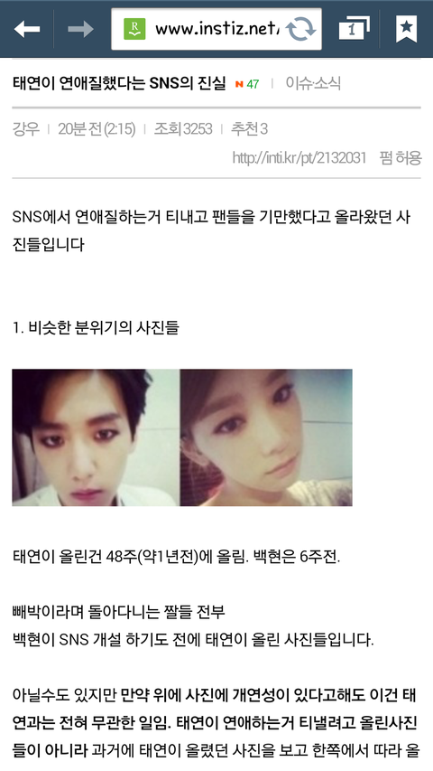 솔직히 오픈카..ㅠㅠ 휴 진짜 다른 소시멤버들은 꼭꼭 숨어 데이트하고 안들키려 노력할때 태연이만 이렇게 들켜서 정말 미웠습니다. 백현이도 조심할 수 있었을텐데 이렇게 들킨게 원망스럽고. 하지만 이 글로 인해서 조금은 팬분들이 오해를 푸시면 하는 바람으로 올려봅니다