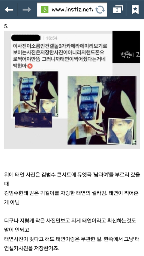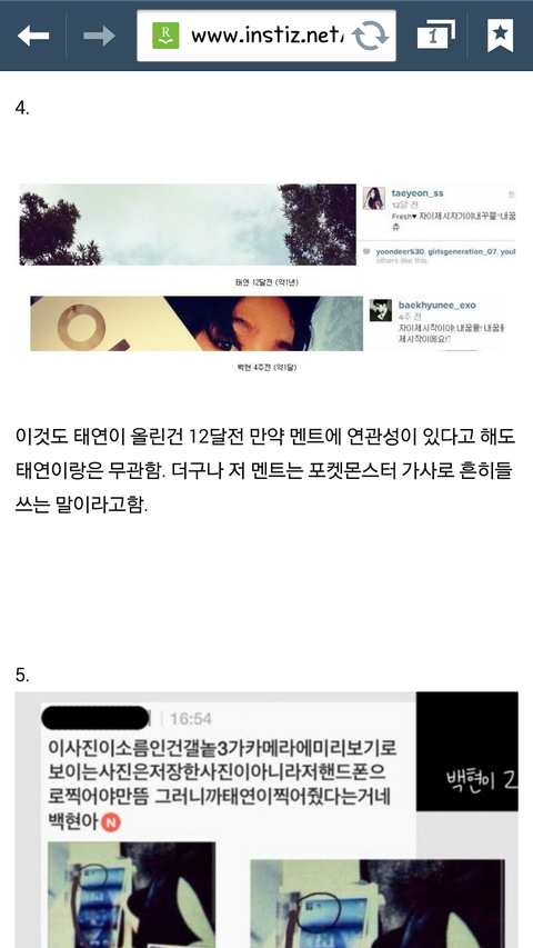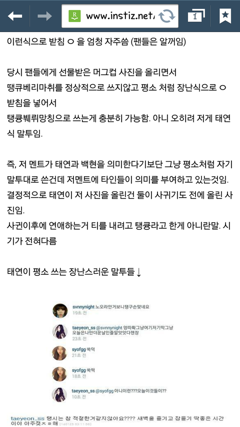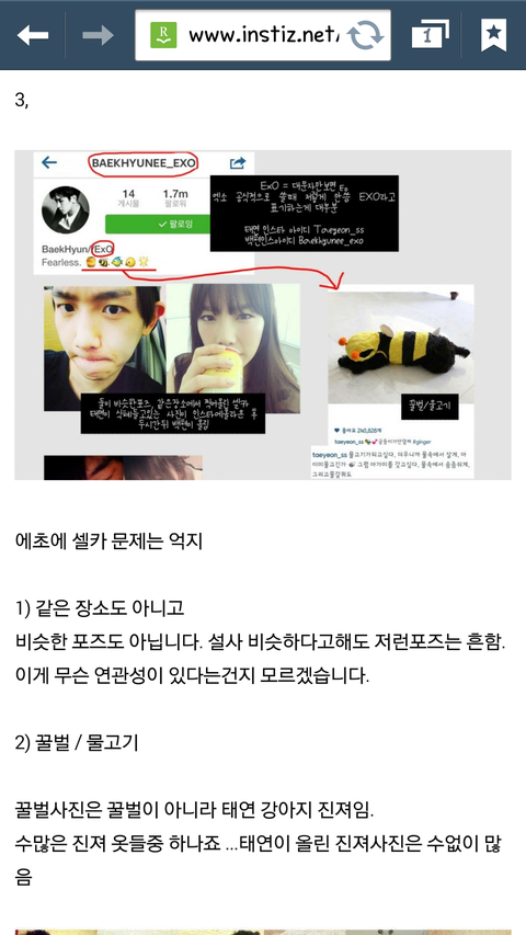 일단 저는 엑소와 소시 모두를 좋아하는 스엠수니입니다. 백현이랑 태연이 사귀는 것이 절대로 문제가 되는 것은 아니지만 대부분의 팬들이 인스타그램에서 연애하고 티나게 즐겼다는 이유로 욕을 많이 하고 있길래 제 생각과 가장 비슷한 해명글을 캡쳐해서 올려봅니다.