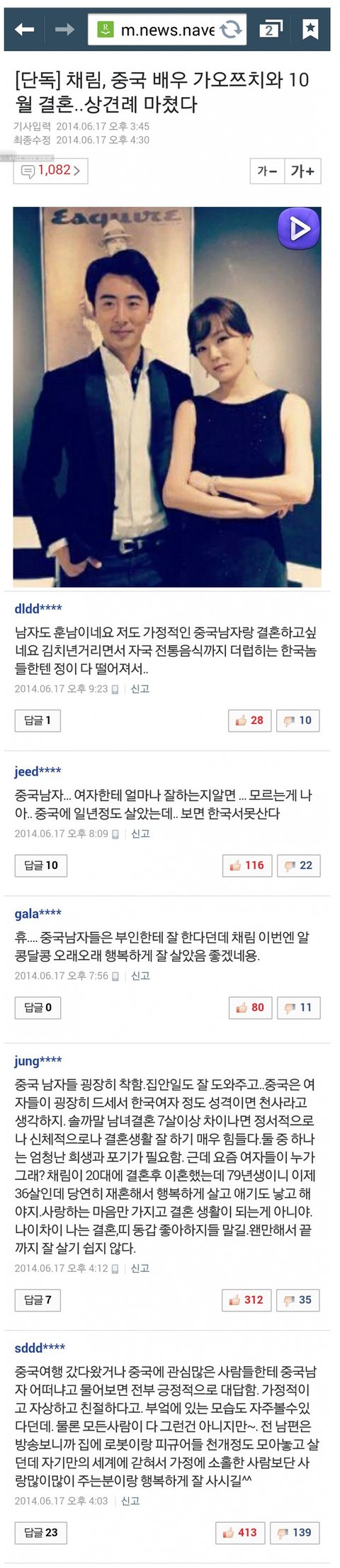 뭔 개소리야...중국은 부부가 거의 다 맞벌이라 집안 일 분담해서 하는거지 그냥 여왕처럼 몸만 와서 시집 가면 되는 줄 앎?그리고 중국 남자 감당하려면 남편하고 어느정도 추잡하게 말 싸움하는거 적응해야됨.이건 다 그런건 아닌데 대부분이 그럼.내가 아직 학생 틀에 있다보니 느껴지는건 중국 남자애들은 입이 험한게 딱히대수롭지가 않아서..중국에 온지 2년 좀 넘어서 중국어 얼추 알아듣는 여자애들은 뒷목잡고 못 알아듣는 애들은 남자애들이 다가가서 젠틀한척 한국 놀리고 지랄하는데도 모르고 병신같이 웃어제낌.아 그리고 이 새끼들은 무슨 한국 여자를 상표 이름으로 보나 한국 여자애들 찔러보고 사진 찍어서 돌리고 낄낄대는 또라이 새끼 패거리도 있었고 난 걔 본적도 없는데 어느날 불쑥 나타나서 나 좋다면서 번호 따가더니 한국보다 중국이 좋다며 중국에서 같이 살자는 미친 놈도 본적 있음.근데 한국 여자에게 중국남이 대세라고? 중국 네티즌이 이 글 보면 얼마나 한국 여자를 웃기게 볼지 상상만 해도 오싹하다;; 안그래도 중국 넷에다 한국 치면 나오는게 한국이 다 지들이 뿌린 씨라서 잘되는거라는 개드립인데;;;;;; 중국 남자가 무조건 다 개같다는게 아님 내 첫사랑도 중국인이였으니까.근데......아 뭐라해야될지도 모르겠다.쨋든 인터넷에서 보이는거 다 쳐믿고 중국 남자 꼬시러 골빈 머리 들고 오지 말라고.참고로 중국 남자들, 아니 중국 남자들은 몰라도 중국 남자애들은 한국 여자면 무조건 다 뽀얗고 여리여리한 줄 알고 나라 의식 개쎔.그래서 한국인은 거의 다 일단 자기보다 한 수 밑으로 본다고 오래 있으면 보이는게 있음 진심 시발 그래서 내가 걔네들 헉하게 할라고 성적 개처럼 올리고 중국애들이랑 친하게 지낸다고 성질 다죽이고 너무 내 나라로 이끌지 않은 화제거리 잡는다고 중국 소설 다 쳐보고...........더 말하면 삼천포로 갈것 같네ㅠ결론은 아나 이 글 제목 보고 혈압 올라서 뒷통수 잡고 뒤로 넘어갈 뻔