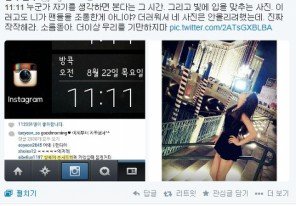 그니까 백현폰이 갤럭시였고 태연폰이 아이폰이였음. 백현은 서울에 있었고 태연은 방콕에 가있었지. 그니까 백현이 11시 11분에 누나를 생각하고 있다 뭐 그런 애정표현으로 화면을 캡쳐해서 태연한테 보냄. 그걸 본 태연은 신나서 그걸 럽스타그램에 올렸고 팬들은 아이폰 기종에서 왜 갤럭시 기종 화면이 나오냐고 반문. 하지만 그런 글은 당시 태연 추종자들의 댓글에 의해 묻힘. 그리고나서 두번째 사진처럼 빛에 입 맞추는 듯한 포즈를 올림. 변백현 초능력 = 빛.