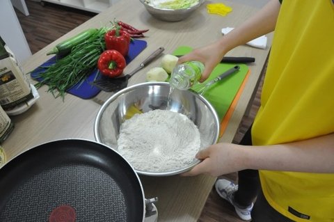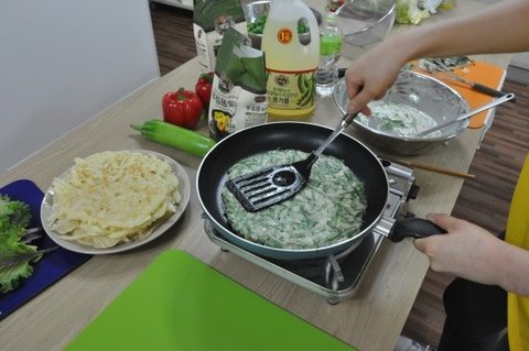예열해 놓은 후라이팬에 반죽을 살짝 올려서 온도 확인, 오올...전문가 뽀스...